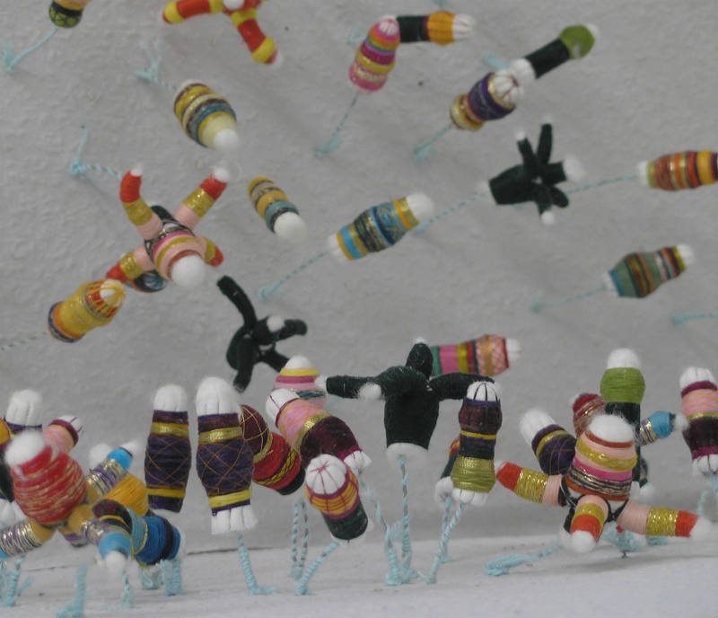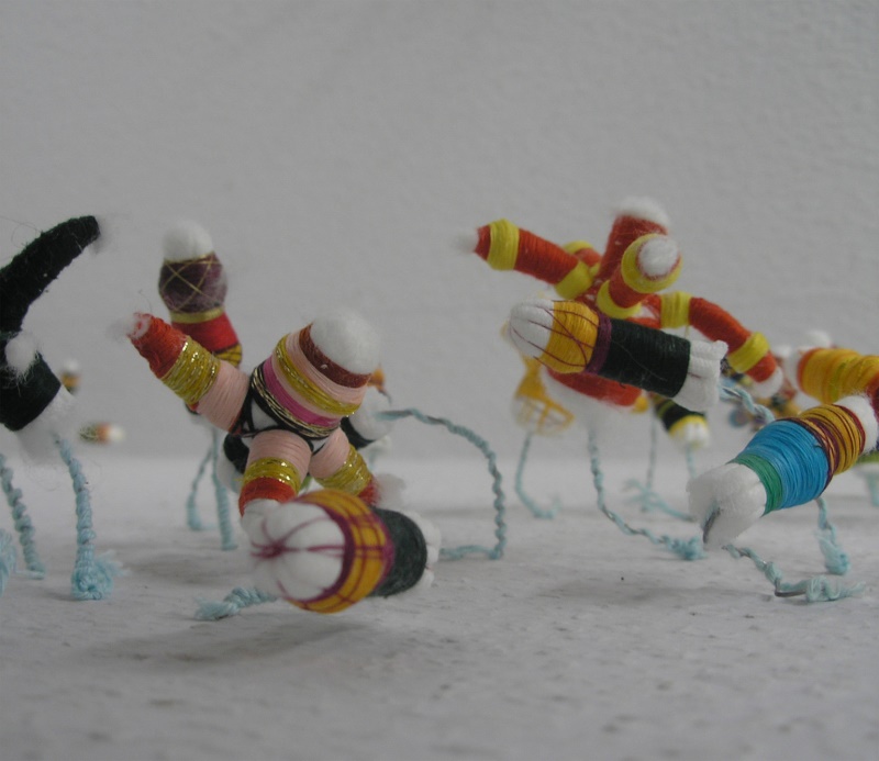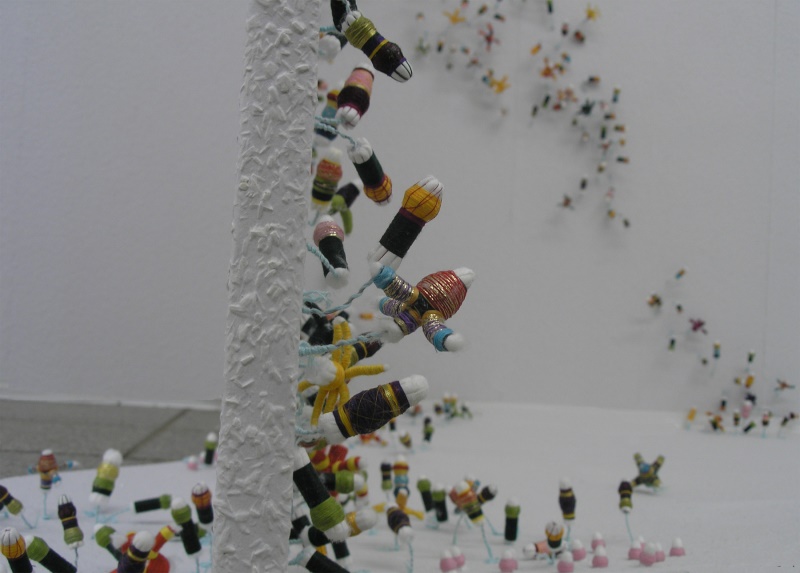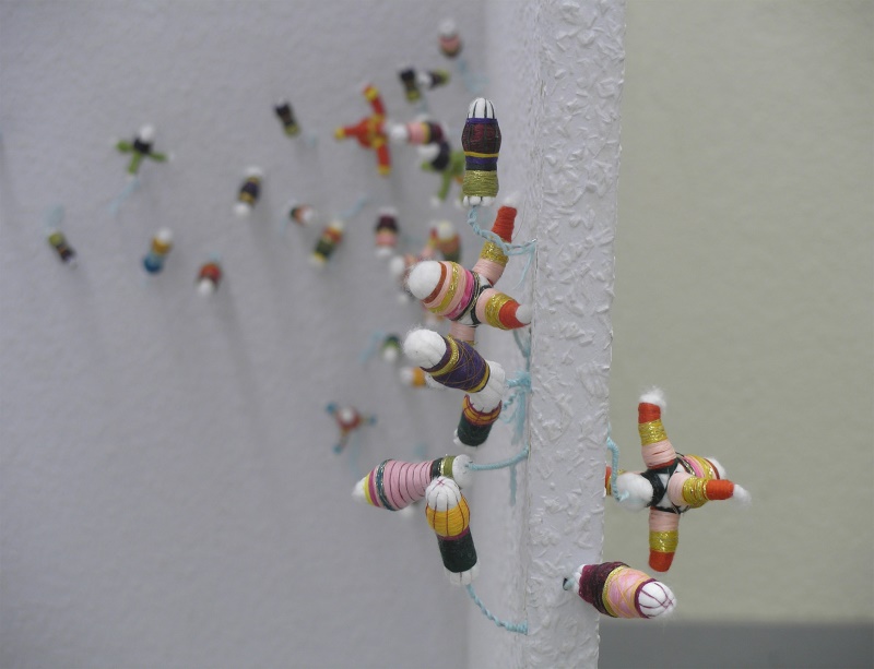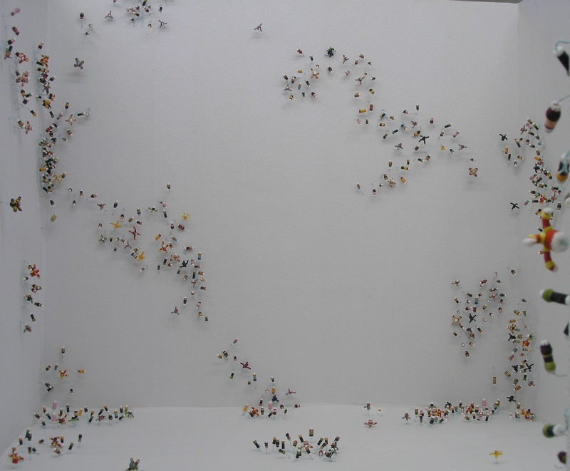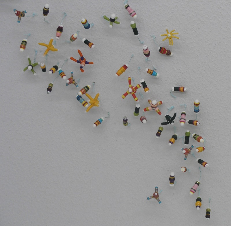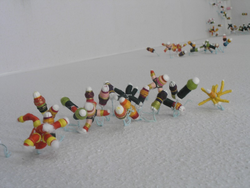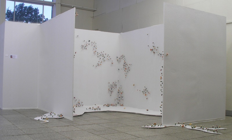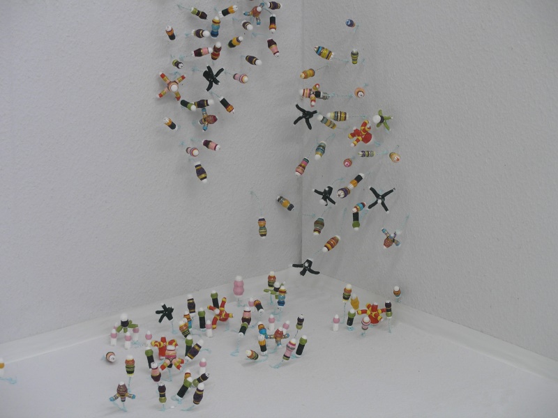 In der Ausstellung „Herbstgeflüster“ installierte ich deshalb ca. 2000 Tamponblumen im Ausstellungsraum. Die Objekte wurden mit Draht auf weißem Untergrund gepflanzt.