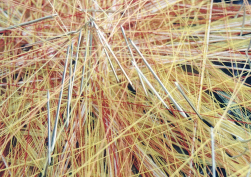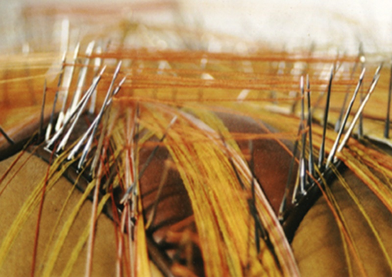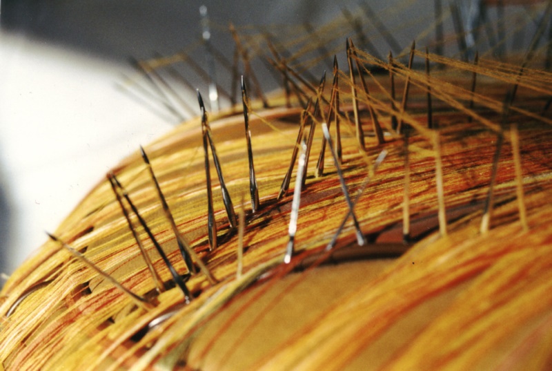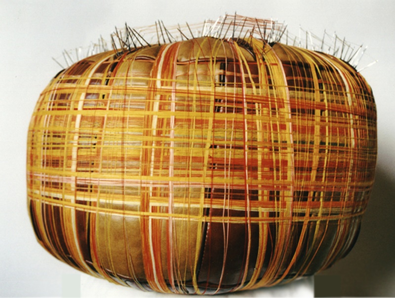 Die Funktionsentfremdung des Fundobjektes erfolgte mit Hilfe von farbigen Garnen, die schon zu seiner Herstellung entschieden beitrugen. Durch die vielfarbigen Umwicklungen und durch das Verweben auf der Oberfläche veränderte sich das Objekt. Es wurde mit neuer Würde umgarnt. Die Farben des Garnes sollten das Objekt neu erstrahlen lassen.