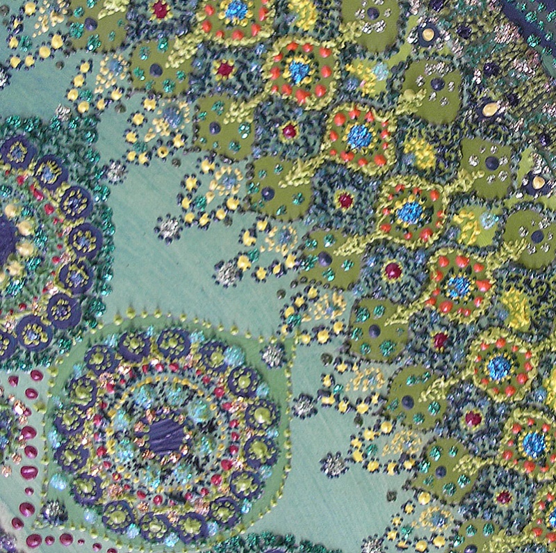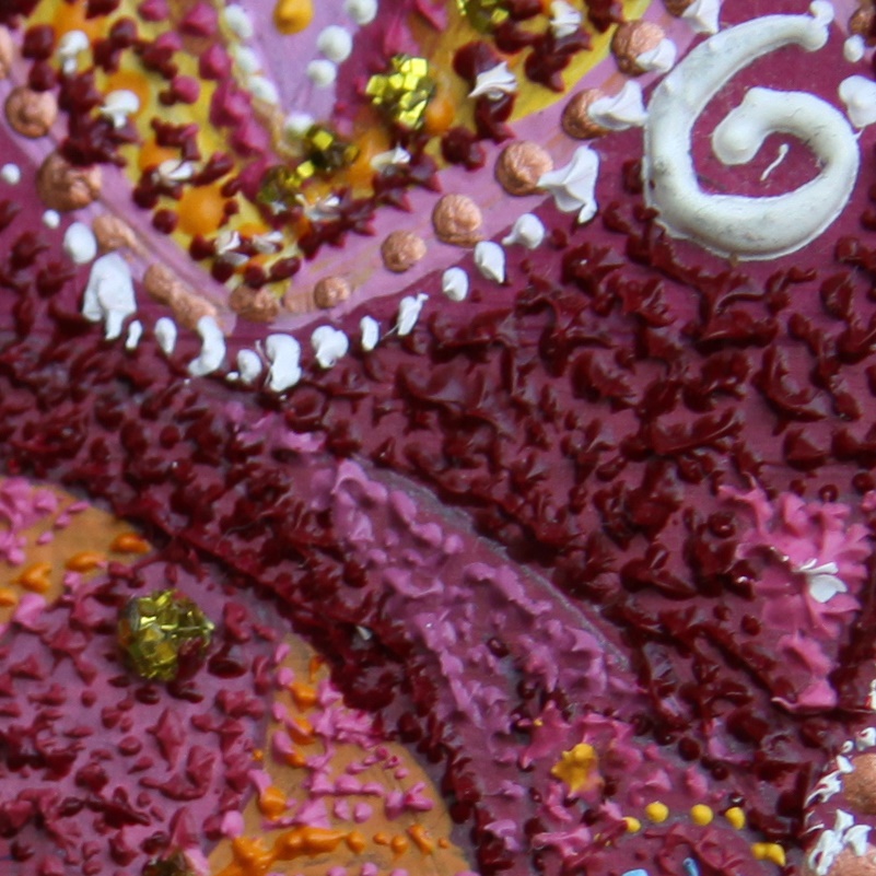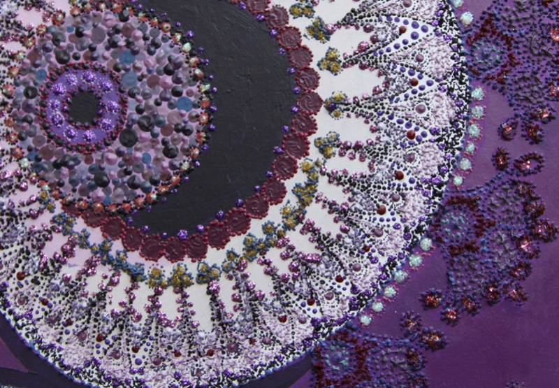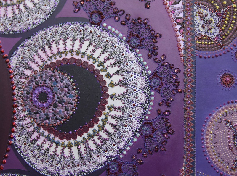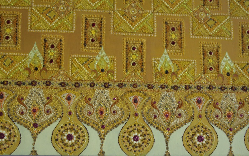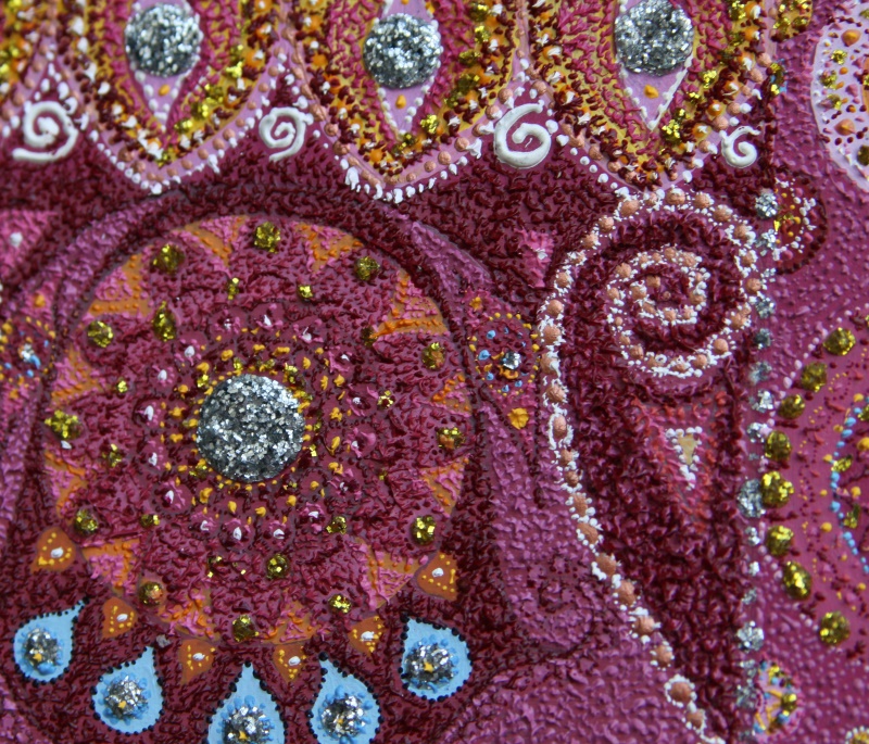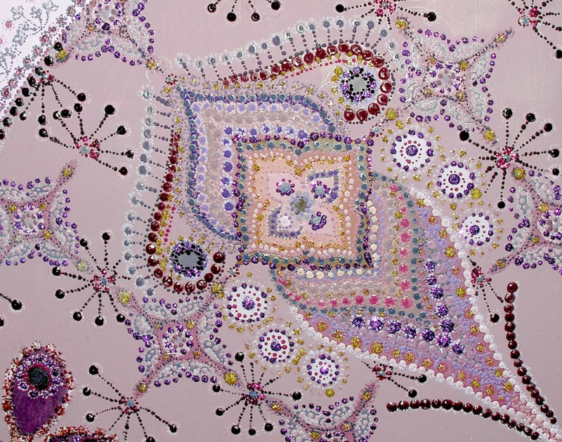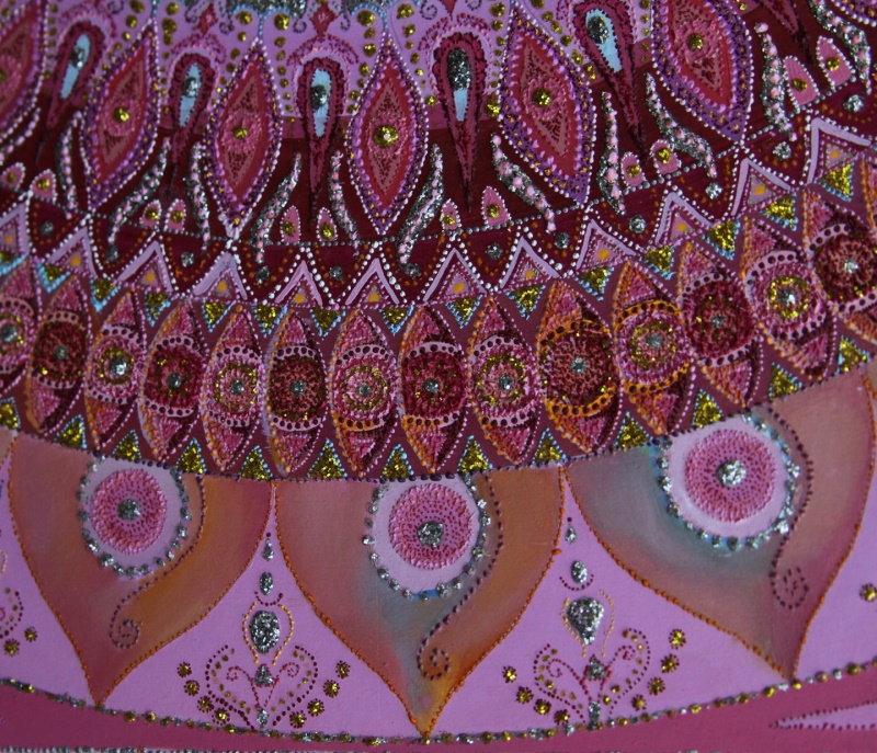 In der künstlerischen Auseinandersetzung reizt mich die Vereinigung von Farbe und Ornament. Während der künstlerischen Arbeit bemerkte ich, dass ich die Spiegelwirkung verstärken musste. Bewusst nahm ich wegen ihres Reizes, neben der Pastellfarbe Rosa, Gold und Silber in meine Farbpalette auf (Spiegel-Trip Nr. I). Die Farbe Gold soll anregend, zugleich inspirierend und Silber neutral widerspiegelnd auf den Betrachter wirken. Bewusst setzte ich auf den Farbflächen Punkte mit einer Nadel, welche die einzelnen ornamentalen Gebilde miteinander verbinden. Wie beim Tätowieren der Haut schmücken sie die Oberfläche der Bilder. Interessant erscheint mir der Aspekt, dass ein Ornament nie für sich allein, sondern immer im Zusammenhang mit einem Gegenstand steht. Die Farbe und das Ornament kleiden den leblosen Stoff (graue Pappe).