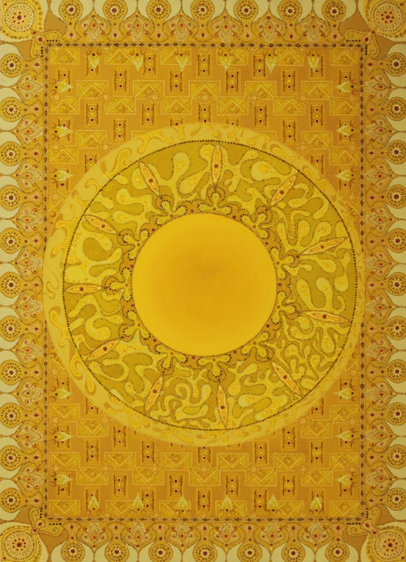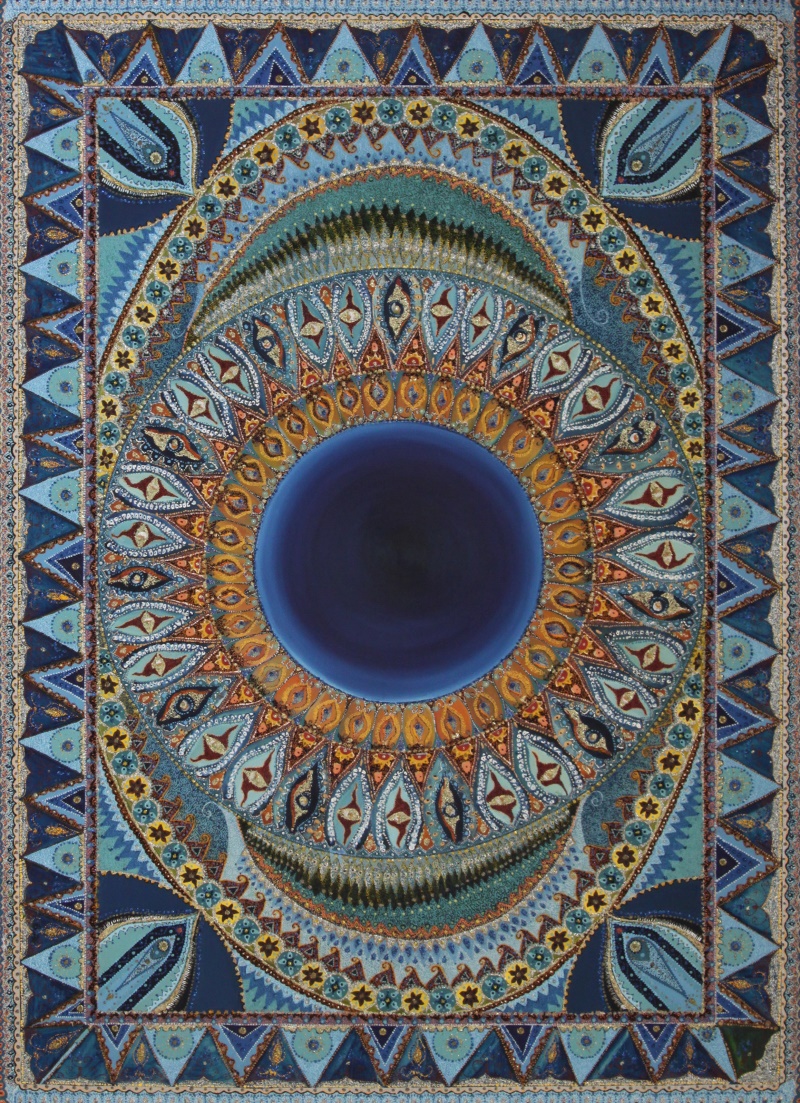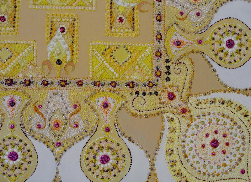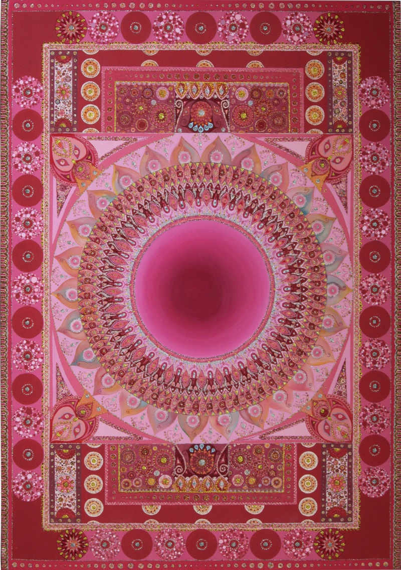 Die nuancenreiche verdichtete Bildoberfläche der verschiedenen räumlichen Ebenen soll, wie ein halbdurchsichtiger Nebel, zum Reisen in ein Land der Phantasien animieren. Traumhaft mit sehnsuchtsvollem Blick soll der Betrachter von der Serie „Spiegel- Trip“ berührt werden. Anhand der Serie „Spiegel-Trip“ (6 Bilder) möchte ich Farben und Ornamente experimentell thematisieren, analysieren und Geheimnisse, die in ihnen verborgen sind, erforschen.