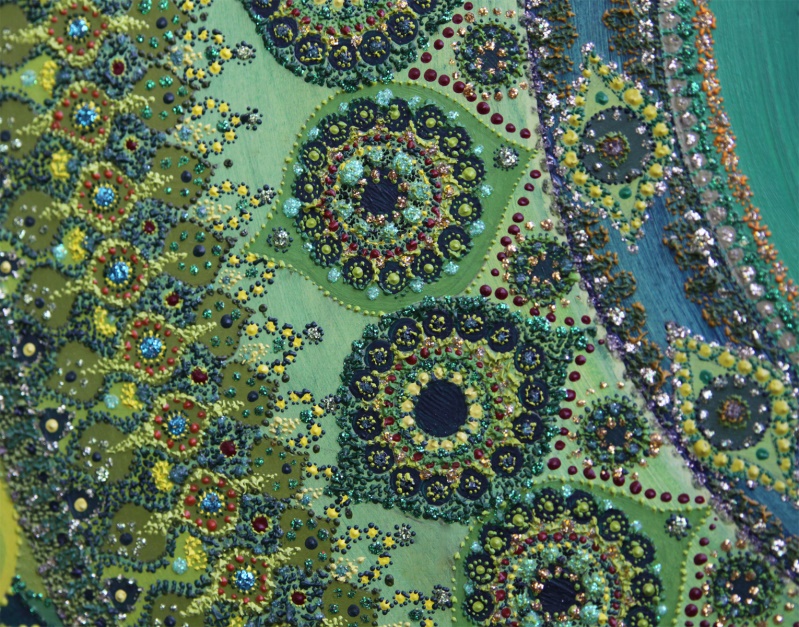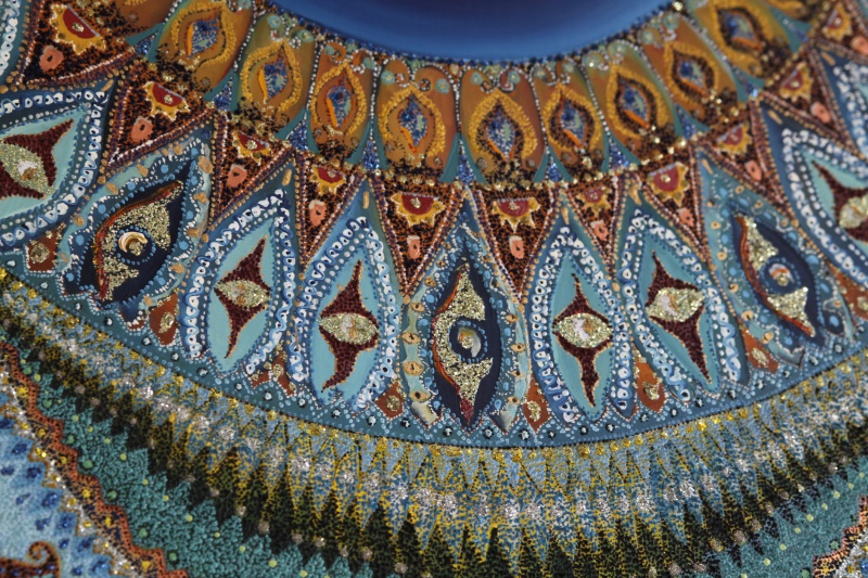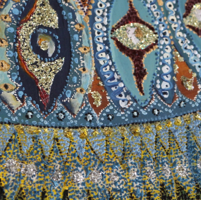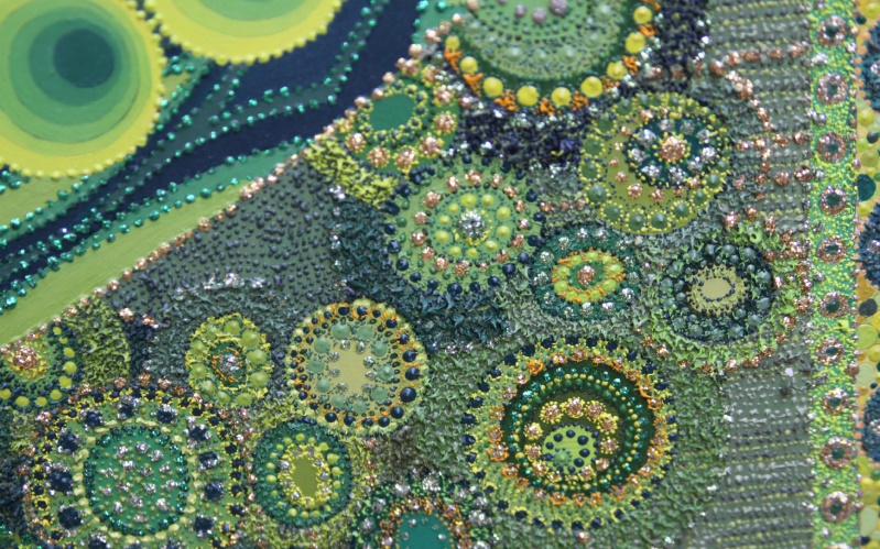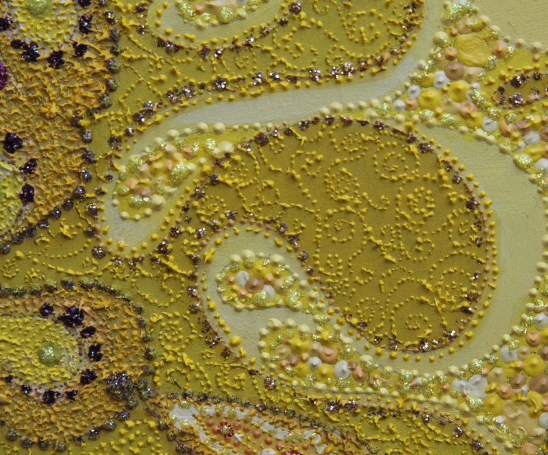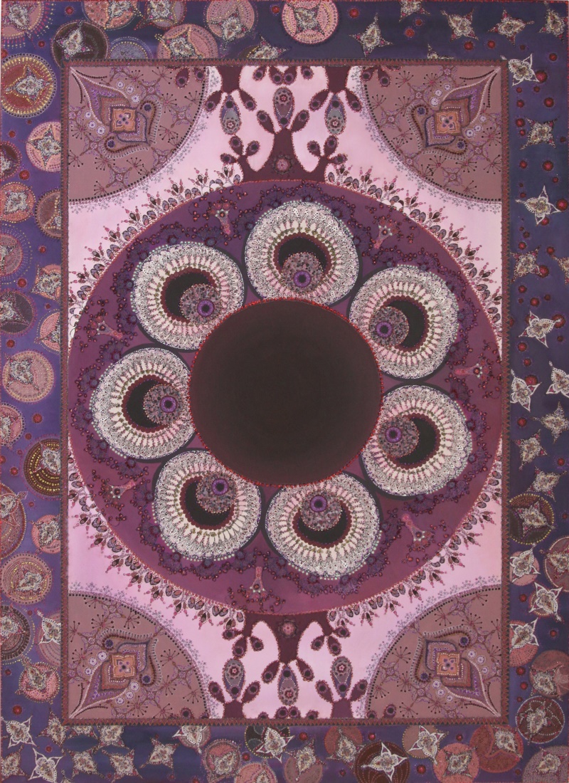 Die nuancenreiche verdichtete Bildoberfläche der verschiedenen räumlichen Ebenen soll, wie ein halbdurchsichtiger Nebel, zum Reisen in ein Land der Phantasien animieren. Traumhaft mit sehnsuchtsvollem Blick soll der Betrachter von der Serie „Spiegel- Trip“ berührt werden. Anhand der Serie „Spiegel-Trip“ (6 Bilder) möchte ich Farben und Ornamente experimentell thematisieren, analysieren und Geheimnisse, die in ihnen verborgen sind, erforschen.