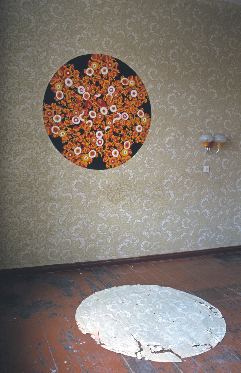 Der Blüte tragende Kreis in seiner harmonischen Form wurde in die von mir zuvor abgelöste Tapete als Spiegel eingesetzt. Durch den Prozess des Häutens wurde die abgelöste Tapete wie eine Hülle abgelegt, in Erinnerung an eine vergangene Zeit und ins neue Leben blickend, ohne das Alte zu vergessen.