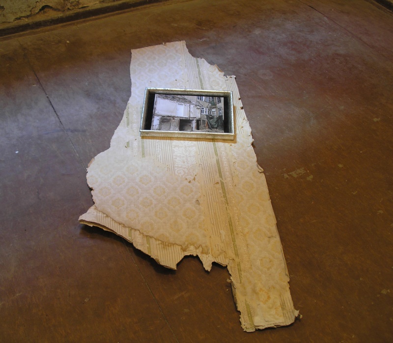 Die Installation „Um die Ecke“ setzte sich aus der detailgetreuen Fotografie als einer Art Reflexion des Fundortes, der Tapete (mehrere Schichten) und einem Schmuckbrettchen (gefunden im Keller des Hauses) zusammen. Bewusst habe ich dieses Bild zur Wahrnehmung, zum Reflektieren, zum Nachdenken und um diese Szenerie vor dem endgültigen Vergessen zu bewahren, in den Kunstraum überführt.